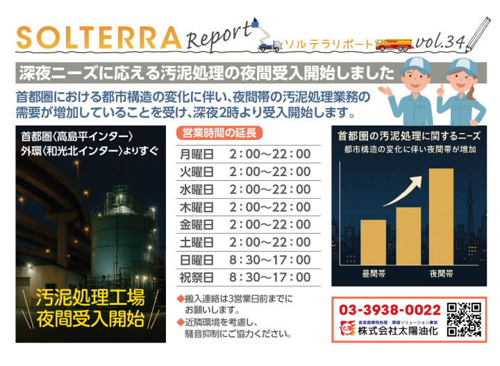 首都圏における都市構造の変化に伴い、夜間帯の汚泥処理業務の需要が増加していることを受け、深夜2時より受入開始しました。