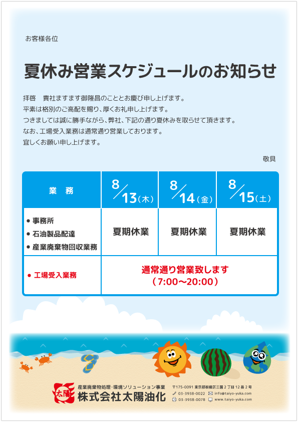 8月13日(木)・14日(金)・15日(土)の3日間は夏休みとさせて頂きます。