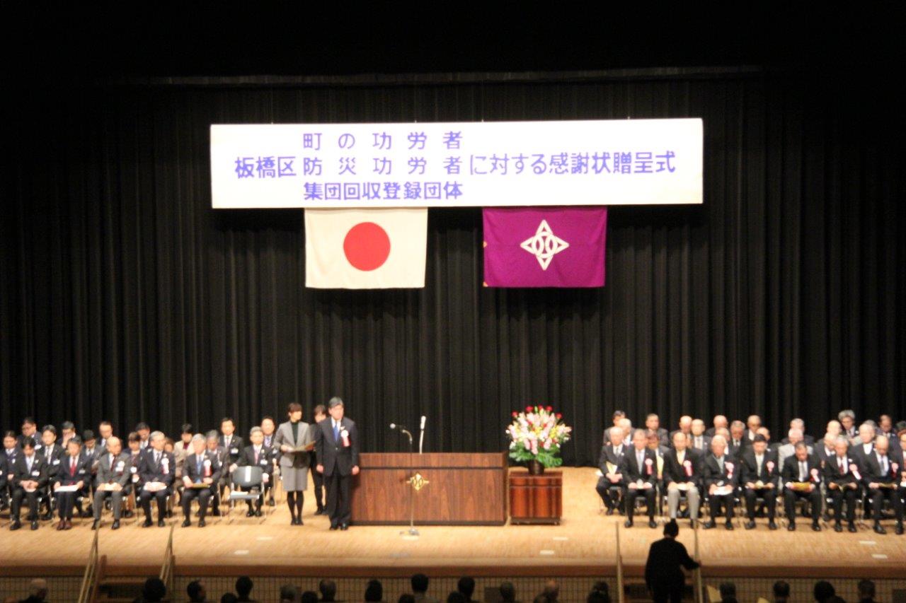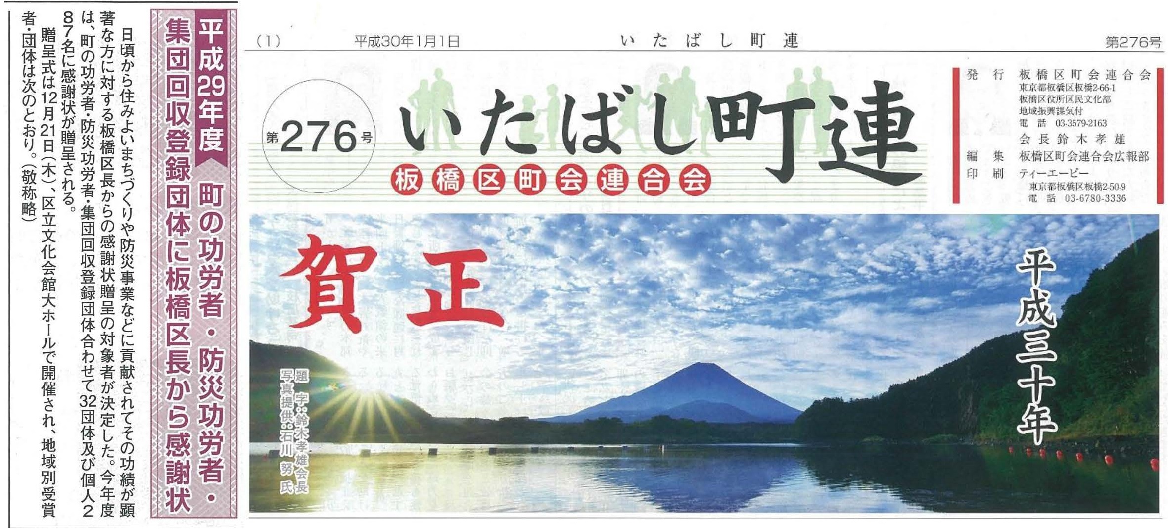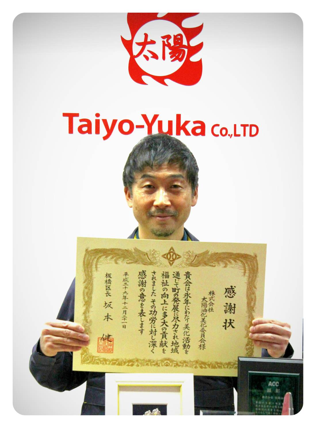 昨年末(平成29年12月21日木曜日)、区立文化会館大ホールで開催された板橋区による感謝状贈呈式にて、町の功労者として『株式会社太陽油化美化委員会』が、日頃から住みよいまちづくりや防災事業などに貢献したという事で感謝状を頂きました。また、贈呈式の様子を板橋区町内会連合会発行のいたばし町連にて紹介されました。