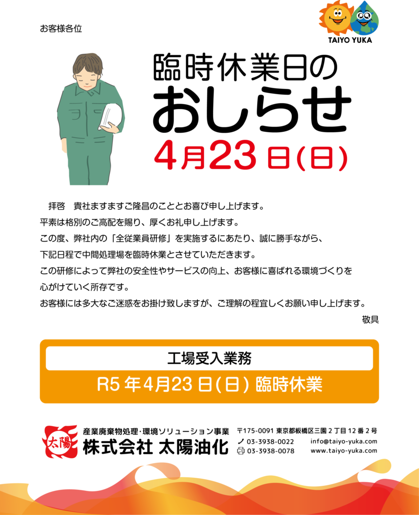この度、「全従業員研修」を実施するにあたり、誠に勝手ながら、下記日程において営業を休業させて頂きます。